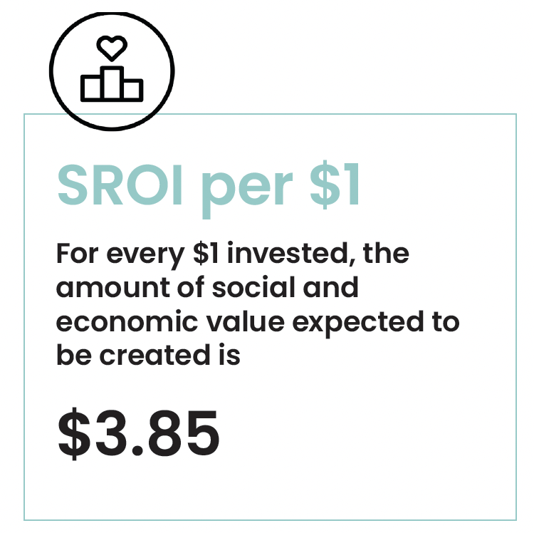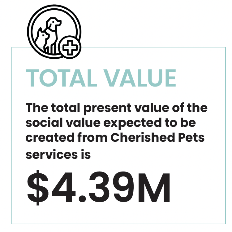 The SROI ratio is 1:3.85 which indicates, for every $1 invested, $3.85 of social and economic value was created across Cherished Pets Community Veterinary Care (social enterprise and BCorp) and Cherished Pets Foundation (social veterinary services).